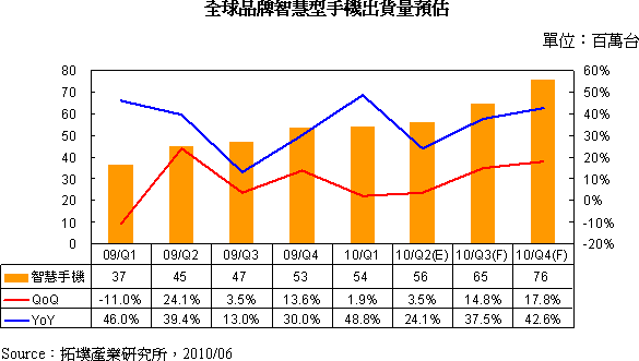 受到新興市場(chǎng)換機(jī)潮與新用戶的加入,以及成熟歐美市場(chǎng)新規(guī)格、新應(yīng)用的持續(xù)推出等因素激勵(lì),拓墣產(chǎn)業(yè)研究所預(yù)估2010年全球品牌手機(jī)出貨量可望達(dá)13.29億支,較2009年成長(zhǎng)11.7%,2010下半年出貨表現(xiàn)將優(yōu)于上半年,通訊產(chǎn)業(yè)研究中心謝雨珊副理分析,在智慧型手機(jī)快速低價(jià)化、iPhone 4上市之下,促使品牌廠相繼推出新款智慧型手機(jī)搶市,預(yù)估2010年全球智慧型手機(jī)出貨量為2.51億支,年成長(zhǎng)率達(dá)37.9%,連續(xù)三年以超過30%以上高成長(zhǎng)率攻占市場(chǎng),2011年全球智慧型手機(jī)出貨量更挑戰(zhàn)4億支關(guān)卡,滲透率將從2010年的18.9%,攀升至2011年的27.6%,屆時(shí)每四款手機(jī)中即有一款是智慧型手機(jī)。
