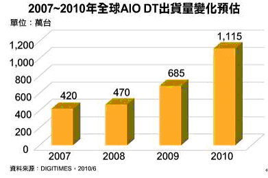 平價(jià)一體式桌上型計(jì)算機(jī)(All In One PC;AIO PC)在2009年創(chuàng)下685萬(wàn)臺(tái),成長(zhǎng)45.7%后,DIGITIMES Research預(yù)估2010年將進(jìn)一步提高至1,115萬(wàn)臺(tái),成長(zhǎng)62.8%,展現(xiàn)新興產(chǎn)品的強(qiáng)勁成長(zhǎng)力道。