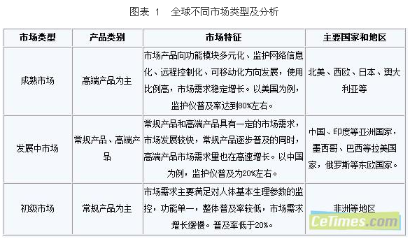 醫(yī)療設(shè)備的發(fā)展與國家和地區(qū)的經(jīng)濟(jì)發(fā)展水平、醫(yī)療政策以及當(dāng)?shù)鼐用袷杖胨较⑾⑾嚓P(guān),這些因素導(dǎo)致全球醫(yī)療監(jiān)護(hù)儀市場發(fā)展不平。根據(jù)市場特征以及對(duì)產(chǎn)品需求的不同可以將醫(yī)療監(jiān)護(hù)儀市場分為成熟市場、發(fā)展中市場和初級(jí)市場。