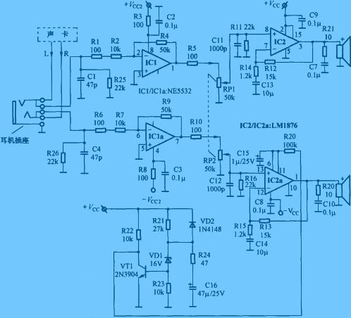 IC1及周圍元件組成緩沖放大級,電路增益=R4/(R1+R2)=50/(10+0.1)≈5倍。為了避免在電腦關(guān)機后,在聲卡停止工作時,前置放大器輸入端懸空,處于高阻抗輸入狀態(tài),將感應(yīng)到的50Hz交流電信號送到后級電路放大,從而在揚聲器中出現(xiàn)較強的噪聲,特設(shè)置了22kΩ電阻R25、R26,這樣不但可以將輸入阻抗限制在22kΩ,避免前置電路工作在高阻抗?fàn)顟B(tài),還可以對50Hz感應(yīng)信號進(jìn)行有效的抑制,提高整機信噪比。