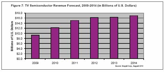 2009年電視半導(dǎo)體銷售額高達(dá)93億美元,由于液晶電視需要更多的半導(dǎo)體芯片支持各種高級功能,2010年銷售額有望更上層樓。iSuppli公司的預(yù)測顯示,2010年電視半導(dǎo)體市場將達(dá)到121億美元。