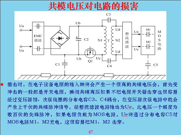 下面講一下共模電壓對電路的損害。其實共模電壓對開關(guān)電容前面的影響不是很大,最大是后面一點,通過電壓器分布電路,以前的模式電路電壓用得很低,都是1v-5v左右,納米級容易擊穿,電容也相當(dāng)小。從里面串進去的電壓經(jīng)過濾波不斷的吸收降下來,一般有上千伏,容易把后面的擊穿。在實踐過程中為了防雷,這幾個位置最好在上面布一個雷點電容,對防雷電擊穿很有效。共模電壓進去以后瞬間擊穿,如果電子沒斷開,外面的電流會繼續(xù)延續(xù)下去把它燒掉,如果備一個電容上去,共模電容通過電容一下子把它吸收掉,讓幾個電容互相通電位,幾個模組不會那么容易擊穿。