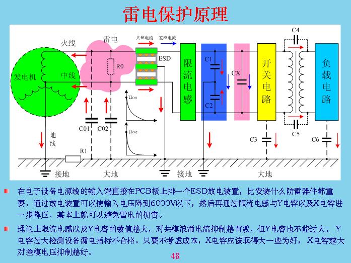 大家想想看,跟前面我們所說的,感應(yīng)雷這個東西沒有一個標(biāo)準(zhǔn)的概念說什么叫做感應(yīng)雷。只要打雷的話,外面打雷,窗戶上面的金屬,如果夜間都可以看到放電產(chǎn)生火花,這就是通過電磁感應(yīng)產(chǎn)生的位移電流原理。從原理上來說,三相四線或三相五線,發(fā)電機有中線接地,設(shè)備使用者的外殼接地是最有效的避雷方法,但現(xiàn)在很多設(shè)備都不接地,沒有辦法接,只有很貴重的進口設(shè)備用三相電源,中間那一條地線,地線不是中線,大家要搞清楚。中線雖然是接地的,但在這里不能當(dāng)成地線,地線一定是自己大樓本身的地,而且要量好接地的地線。因為地線接進去以后,大樓對外面的電磁層進行屏蔽了,大樓相對來說也是導(dǎo)電的,就算不導(dǎo)電,現(xiàn)在國家都有安全要求,大樓超過多少層都要加上避雷針,就是防雷的。如果不能接地,你就要考慮充放電的問題。前面最好的共模電容我覺得還是要,我認為這個共模電容最好連接上,不能接大地,要接在外殼上,接到外殼上有什么好處?共模電壓一進來,雖然電流沒有通過地放電回路,把電壓舉高起來了,與外面輸入電壓是一樣的,外殼電壓取的一樣,起到了屏蔽作用。如果這個接地的話會更加安全,但是地線要足夠粗,回路也足夠,因為放電的電流很大,很容易燒掉。這幾個東西是經(jīng)過很多年的試驗,8是很成熟的東西,不管做共模還是防雷都要做上,如果連機殼都沒有,只是塑料殼,也要考慮這根線接到什么位置最好?是接到里面面積最大的地方,就是公共地面積最大的地方,讓電位舉起來,其他電位差不會產(chǎn)生很大的電容回路。主要是考慮充放電回路,電流越小越好,兩個電位差越小越好。