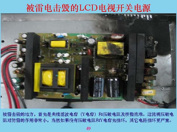 下面我們講一些具體的。這是一個開關(guān)電源,開關(guān)電源被雷劈的時候,輸入回路基本上都燒了,假如沒燒是什么樣的?可以看看,這是橋堆,這兩個是Y電容,這里面還有一個壓敏電阻。這是共模線圈,雷劈以后全部燒了,說明壓敏電阻沒有起到什么保護作用,兩個電容都燒了,說明電感相當(dāng)、相當(dāng)?shù)馗?。為了防止雷電,首先前面一定要加一個能量吸收,比較大的東西,成本相對來說比較低,像試驗站里面的放電裝置,那個東西沒有地方裝,也貴得很。在硬紙板上面排幾個鋸齒,中間隔一個頭就行了。如果中間隔6mm也可以。有一個一級電感,電感可以使瞬間上去很快的電壓降下來,突然加一個1萬伏、10萬伏,加上去只有這兩端,另外兩端建立不起來,所以剛加進去的時候?qū)纂妬碚f,大部分能量都被吸收掉了。后面經(jīng)過這個以后,剩余部分通過共膜電容繼續(xù)吸收,吸收完以后還有差模部分,產(chǎn)生的差模部分通過電容把差模吸收掉。共模電容和差模電容具有抑制傳導(dǎo)干擾的作用,對雷電也有抑制作用,所以很多人也在問,電容接到前面好還是接在后面好?這個東西看你有什么作用,如果只是為了防EMI電磁干擾的話,接在越前面越好,接在測試儀表的輸入端最好,接到那里把信號全部短路掉了,就看不到了。但是對于雷電,你接到后面要好很多,所以這主要是防雷的,你就不要考慮電磁干擾和EMC了,盡量把兩個放在后面。