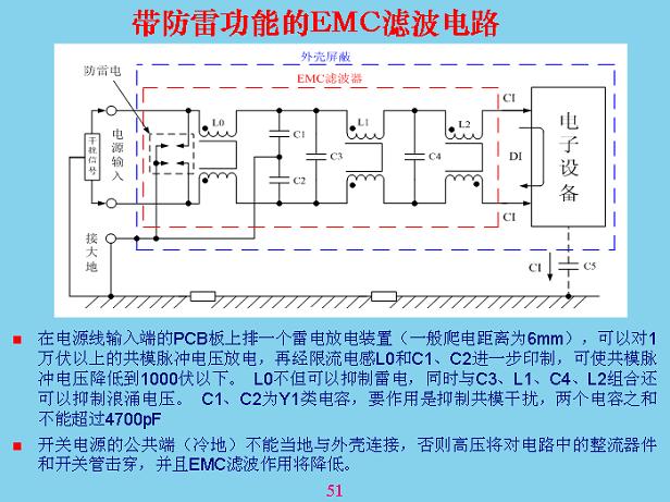 按照道理EMI是電磁干擾,避雷元器件按照道理并不聯(lián)系在一起,但EMC濾波里面,與EMC濾波器同樣有防雷功能,就是前面的幾個電感和共模電容還有差模電容對防雷都起到作用,大家要理解,EMC濾波是用于設(shè)備上的,但反過來考慮雷電的時候,你就要把干擾信號從外面輸進來,要這樣考慮了,不能單方面,最好在防雷加上一個放電裝置加在電感后面,共用共模濾波電容。