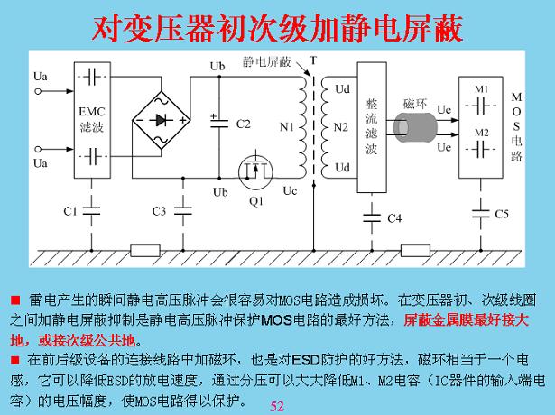 對于一些比較貴重的儀器、設(shè)備,在開關(guān)電容電壓器這里最好做靜電比例,在初次級線圈中間做一個鋁箔片都可以,包一層,這層不能短路,短路的話變壓器就會燒掉,包在外面可以短路,包在里面不能短路,包在外面吸收漏電電感,包在里面的主回路里面會短路,然后把它進行接地,這相當(dāng)于可以隔離掉。這個有一個教訓(xùn),前段時間康佳臺灣裝LCD屏測試,打了一個隔離變壓器,后面就是接測試儀表,每個月都有一臺、兩臺測試儀表損壞,查不出原因,最后讓他們把隔離變壓器的中間屏蔽才好。屏蔽以后,進一步有機會的話,在接頭有連接的地方加一個磁環(huán),讓共模電壓將磁環(huán)速度放慢,緩沖一下,讓瞬間能量降低,瞬間能量緩慢一點,慢慢的過,損傷就會少很多。所有電路都可以把它看成一個分布電流,只要某地方電壓電位在改變,對后面都會產(chǎn)生充放電,從這上面理解就知道了,如果哪個地方構(gòu)成回路,如果有一個高電壓進來一直傳導(dǎo)到后面,最后充電,充電可以理解成分布電容,如果沒有這個也有一個分布電容在里面,把分布電容放在這里,就比較形象地。就像以前的絕緣長效濾管一樣,手一摸沒有造成回路也壞掉了,絕緣的濾管很容易壞,一從里面拿出來,手一摸就壞掉,一個身上面帶正電,或者你作為天線有感應(yīng)電壓,感應(yīng)一下來回充放電就壞掉了。