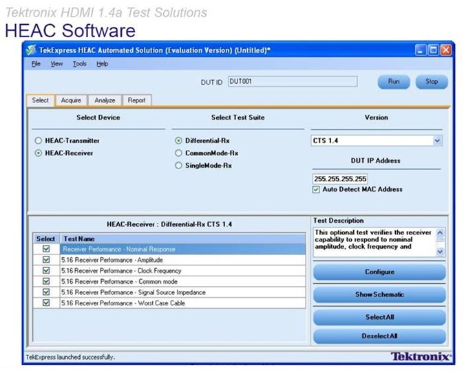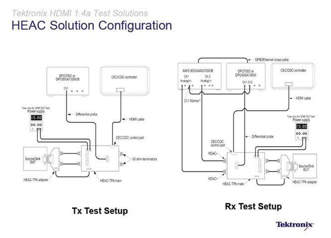 泰克的測試解決方案不僅Type D(移動HDMI)和Type E(車用HDMI)新興應(yīng)用通吃之外(無需硬件仿真器,并且相關(guān)夾具產(chǎn)品都通過了CTS1.4的批準),而且還能實現(xiàn)驗證HDMI 以太網(wǎng)和音頻回傳通道(HEAC) 、3D HDMI強制格式、4K x 2K 和新的色彩空間格式。HEAC的物理層測試包括以太網(wǎng)發(fā)送、接收測試;音頻發(fā)送、接收測試;以及設(shè)備阻抗測試和線纜測試。同樣是通過軟硬件結(jié)合進行模擬的方法使得用戶無需投資購買更多測試儀,只要購買相應(yīng)夾具,可在原有示波器、信號發(fā)生器的基礎(chǔ)上進行配置,可產(chǎn)生真正的HEAC信號。