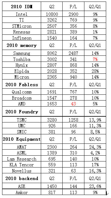 以下提供2010 Q2全球半導(dǎo)體業(yè),包括部分IDM、Memory、Fabless、Equipment、Foundry及Backend公司的業(yè)績匯總,僅供參考。內(nèi)容下載于web site,由于每個(gè)公司的Q2季度時(shí)間上不同,特此說明。其中紅色表示負(fù)值。