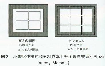 如果在一個(gè)方向持續(xù)地發(fā)生不正確的變化,在生產(chǎn)期間通過(guò)調(diào)整處理,可以很容易地得到糾正。但是在PCB生產(chǎn)過(guò)程中大多數(shù)的隨機(jī)變化是很難予以控制的。在實(shí)際生產(chǎn)過(guò)程中,每塊面板的尺寸可能會(huì)發(fā)生變化。當(dāng)設(shè)計(jì)規(guī)定的允許誤差為100μm或者更大的時(shí)候,這可能不會(huì)是什么問(wèn)題。然而,當(dāng)把大量的功能放入一個(gè)很小的空間時(shí)這就意味著設(shè)計(jì)規(guī)定的允許誤差趨小。當(dāng)裝配人員將PCB組件放置入較小形狀的面板上時(shí),隨機(jī)變化現(xiàn)象將會(huì)大大的減少。但令人感到遺憾的是,這將涉及到大量的成本問(wèn)題:為了滿足小型化面板的需要,需要更多的處置成本,材料的利用則會(huì)降為比較次要的問(wèn)題(圖2)。