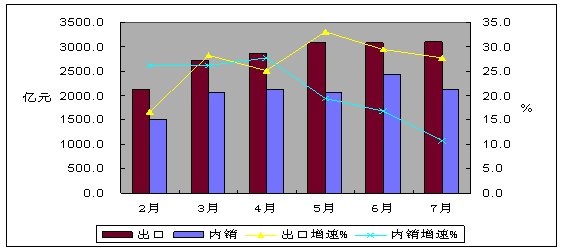五、內(nèi)外銷增速差距拉大,出口依存度繼續(xù)提高。今年以來(lái),隨著外需不斷回暖,外銷出現(xiàn)持續(xù)增長(zhǎng),到7月底,外銷增速已經(jīng)連續(xù)5個(gè)月超過(guò)30%,并超過(guò)內(nèi)銷增速6.5個(gè)百分點(diǎn)。其中,內(nèi)銷產(chǎn)值14086億元,同比增長(zhǎng)23.9%,比上半年回落3.3個(gè)百分點(diǎn),低于產(chǎn)業(yè)平均增速3.7個(gè)百分點(diǎn);出口交貨值19752億元,同比增長(zhǎng)30.4%,高于產(chǎn)業(yè)平均增速2.8個(gè)百分點(diǎn)。產(chǎn)業(yè)出口依存度(58.4%)比去年同期提高1.3個(gè)百分點(diǎn),比上半年提高0.3個(gè)百分點(diǎn)。