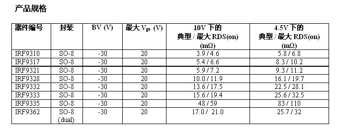 全球功率半導(dǎo)體和管理方案領(lǐng)導(dǎo)廠商 – 國際整流器公司 (International Rectifier,簡稱IR) 推出新系列-30 V器件,采用 IR最新的SO-8封裝 P 溝道 MOSFET硅組件,適用于電池充電和放電開關(guān),以及直流應(yīng)用的系統(tǒng)/負(fù)載開關(guān)。新款 P 溝道器件的導(dǎo)通電阻 (RDS (on)) 為 4.6 m?至59 m?,可匹配廣泛的功率要求。P 溝道 MOSFET 無需使用電平轉(zhuǎn)換或充電泵電路,使其成為系統(tǒng)/負(fù)載開關(guān)應(yīng)用非常理想的解決方案。