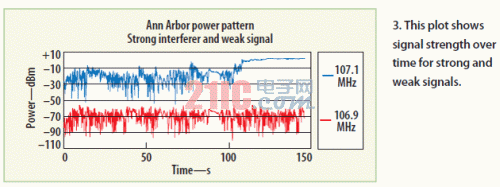 圖1顯示了這次在地圖上的測試行駛,其中3kW的發(fā)射機(jī)架在高大建筑物的樓頂。雖然天線在直接視線范圍內(nèi),但干擾源處于峰值水平,接收到的106.7MHz目標(biāo)頻率信號質(zhì)量下降嚴(yán)重。圖2顯示了信號強(qiáng)度的典型頻譜,圖3顯示了測試行駛期間2個(gè)信號的強(qiáng)度。