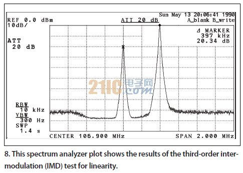 在使用系統(tǒng)之前要對測量裝置進(jìn)行測試,以便確認(rèn)測量裝置不會引起任何可能降低測量精度的顯著噪聲或失真。還要通過調(diào)整相對的插入值對功率電平進(jìn)行校準(zhǔn)。指定電平在合成器輸出端——收音機(jī)天線連接點(diǎn)進(jìn)行測量。線性度在要求的信號電平之上測量,要做到這一點(diǎn),必須將兩個(gè)發(fā)生器在各自頻率處設(shè)為CW模式,并且總功率電平要超過測試案例中使用的值。參考圖8,發(fā)生器1被設(shè)為0dBm,發(fā)生器2被設(shè)為-20dBm。這里沒有可測量的三階互調(diào)(IM3)。圖7描述了被設(shè)為接近最大測試條件的信號。