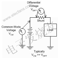 負載或電源的低壓側或高壓側都可進行電流檢測。共模電壓是指分路(shunt)上的電壓(不是分路上的差分電壓),在低壓側檢測為零伏。低壓側檢測最簡單,可采用最基本的放大器電路。低壓側檢測的難點在于:低壓側檢測會影響系統(tǒng)的接地端,可能還需要增加更多的線路,而且這種作法通常不利于故障診斷。圖1中的高壓側分路放大器可檢測很高的電源電壓上極低的差分電壓(通常為100mV或更低),通常在車載應用中為13.8V。不過,如果為無限制的(unconditioned)電池線路,那么會受瞬變影響:如果無意中將電池方向放錯就會出現(xiàn)–13.5V的情況,如果出現(xiàn)負載突降或感應反沖,那么最大瞬變可達72V。不妨設想,放大器通常采用5~12V的單電源供電(5V的電源供電日益常見),這就需要放大器的輸入引腳連接到共模電位,大大超過了放大器電源軌的限制。