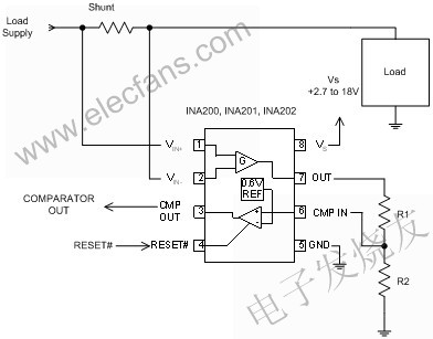 在許多應用中,電流應與某個設定值相比較。通常說來,進行電流比較還需要電流分路監(jiān)控器、比較器和參考電壓。此外,理想的比較器輸出應與大多數(shù)常見的邏輯電路很好地兼容。圖5給出了電流比較的例子。在本例中,將電流與采用TIINA200系列電流分路監(jiān)控器和比較器的簡單單電壓結點進行了比較。R1和R2形成分壓器,以根據(jù)INA200系列比較器的內置0.6V電壓結點來設置電壓結點。(INA200系列的增益很有特點:INA200的增益為20,INA201的增益為50,INA202的增益為100。)