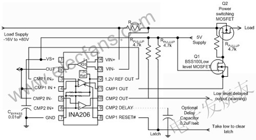 圖6在該雙電平電流比較電路中,低電平延遲輸出可對即將發(fā)生的過載發(fā)出警報,支持鎖存功能的上限可將負載電源關閉。