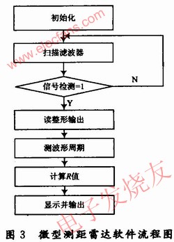 雷達工作時,單片機控制窄帶濾波器不斷的進行掃描,當某一個濾波器有信號時,由可重觸發(fā)單穩(wěn)態(tài)電路組成的信號檢測電路輸出由“0”變?yōu)?ldquo;1”,單片機根據輸出的窄帶濾波器獲得帶內頻率,判斷出精度不太高的距離范圍,利用放大整形輸出進行計數或測量脈沖的周期,獲得足夠精確的頻率值,即為準確距離。根據公式計算出R和V送顯示器予以顯示,或通過RS232串口送上一級的計算機系統(tǒng)。
