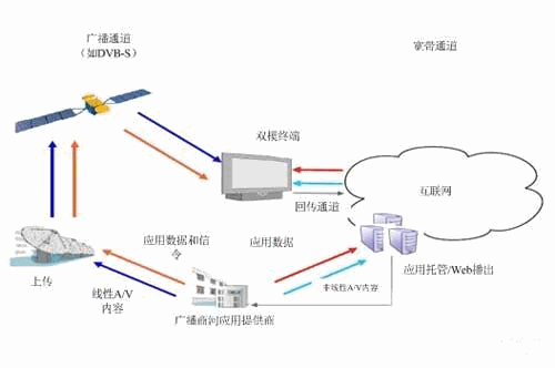 對運營商而言,數(shù)字電視數(shù)據(jù)業(yè)務(wù)可能來源于廣播信道(衛(wèi)星、有線或無線等)和/或?qū)拵诺溃ɑヂ?lián)網(wǎng)、或其它的IP通道)的信號,音視頻與數(shù)據(jù)可以不加區(qū)分地由這兩個通道分別接入,在帶寬限制的情況下,廣播通道可以用來播送高清節(jié)目,而寬帶的使用形式就會有很廣,如視頻點播、時移、信息瀏覽、電子商務(wù)等。