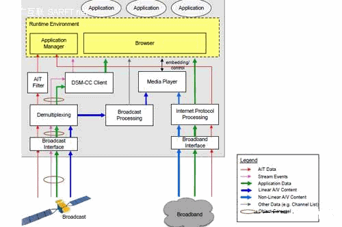 HbbTV支持兩種類型的應(yīng)用:1)廣播電視相關(guān)的應(yīng)用,通過廣播電視通道傳送;2)獨立于廣播電視的應(yīng)用,它們不通過廣播電視通道傳送。