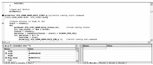 以配置開始指令的發(fā)送為例,從圖3圖4兩圖中可以看出軟硬件交互過程中的指令發(fā)送方式,在VC++中單步調(diào)試,發(fā)送一個(gè)開始指令0x01到配置命令寄存器地址0x01,通過硬件模塊的接口動(dòng)作,用嵌入式存儲(chǔ)器SignalTapII中捕捉到LA的數(shù)據(jù)為1h,LD上的數(shù)據(jù)為1h后ConfigStart寄存器置高,配置開始。
