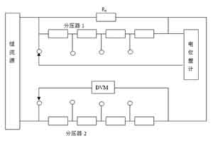 如圖2所示,圖中是本文提出的一種新的測(cè)量電阻負(fù)載系數(shù)的原理線路。它主要由直流恒流源、被測(cè)電阻Rx、精密分壓器、直流電位差計(jì)和7位半直流數(shù)字表(DVM)組成,其中分壓器1和Rx并連,其中分壓器1中的電阻1大于10Rx;分壓器2串連到電路中,其中分壓器中的電阻1小于0.1Rx。兩個(gè)分壓器各自由n個(gè)電阻組成?,F(xiàn)取n=4扼要說(shuō)明其工作原理。