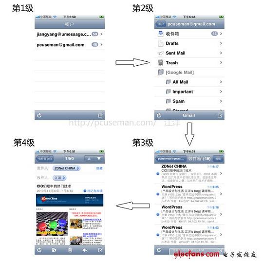 ②對確認的功能結(jié)構(gòu)考慮在iPhone上的信息架構(gòu)模型。上文說過,iPhone應(yīng)用是線性的連貫操作,一層一層進入直到完成最后的任務(wù),所以你要按這個思路去整理信息架構(gòu),一般來說,操作的深度不要超過3層,如果超過3層就要對產(chǎn)品形態(tài)進行扁平化處理,即由深度改為廣度,因為隨著深度的增加,每一級別都會有不同的功能,甚至有承載上一級的功能或邏輯,深度越多,這些功能就會越復雜,而在手機如此小的空間上就很難進行合理組織。