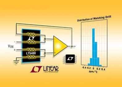 凌力爾特公司(Linear Technology Corporation)推出公司第一個精確匹配的電阻器網(wǎng)絡(luò)器件系列LT5400,該系列器件為差分放大器、精準(zhǔn)分壓器、基準(zhǔn)和橋式電路中的高性能信號調(diào)理應(yīng)用而設(shè)計。三款可選版本已全面投產(chǎn),分別是電阻比率為1:1和10:1的四個10K電阻、四個100K電阻和兩個10K/兩個100K電阻。每款LT5400系列器件在-40℃至85℃的溫度范圍內(nèi)提供了0.01%的保證匹配準(zhǔn)確度,而在-40℃至125℃則提供 0.0125%。LT5400的匹配性能利用“CMRR 匹配”得以增強,這是在采用差分放大器電路配置時用于保證CMRR性能的一種新度量標(biāo)準(zhǔn)。LT5400的CMRR匹配誤差僅為0.005%,比采用獨立電阻器時的0.01%匹配誤差改進了2倍。