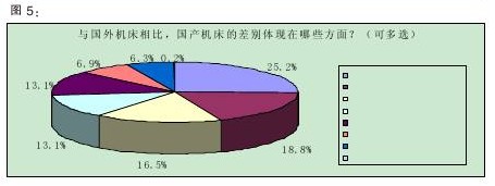 中外機床產(chǎn)品的差距依然巨大據(jù)中國機床工具工業(yè)協(xié)會統(tǒng)計,2010年我國機床工具產(chǎn)品進口總額為157.2億美元,同比增長62.0%,國內(nèi)機床進口額與歷史最高的2008年同期相比還增長了27.8%,創(chuàng)歷史新高。進口的增長迅猛表明國內(nèi)機床與國外機床的差距依然很大。本次調(diào)查報告顯示,中外機床的差距主要體現(xiàn)在三個方面:加工精度(25.2%)、可靠性(18.8%)、機床內(nèi)部電、氣、控等配置(16.5%)。緊跟其后的是加工速度和外形方面的色彩、精美程度等,均占13.1%(詳見圖5)。由此可見,技術(shù)尤其是對精準(zhǔn)度和可靠度是國外機床領(lǐng)先國內(nèi)機床的優(yōu)勢來源。另外,對外形的關(guān)注也是近年來客戶在使用方面出現(xiàn)的一種新口味。
