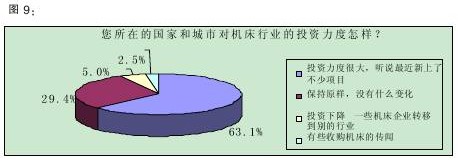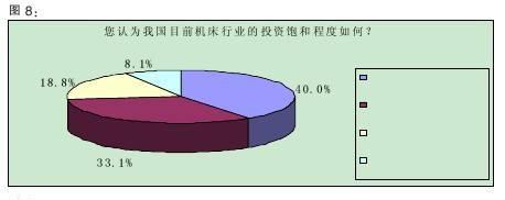 調(diào)查數(shù)據(jù)顯示,40.0%的受訪者認(rèn)為我國目前機床行業(yè)的投資“大體上飽和,但還有投資空間”,33.1%認(rèn)為“不飽和,還需要加大投資力度”。(詳見圖8)該結(jié)果表明,三分之一的被訪者認(rèn)為機床行業(yè)還有投資的空間,加上那些認(rèn)為投資空間很大的比例,有超過一半的人認(rèn)為機床行業(yè)還應(yīng)該增加投資,業(yè)界對機床行業(yè)的預(yù)期由此可見一斑。