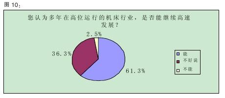 據(jù)年初中國機床工具工業(yè)協(xié)會的預(yù)測,2011年機床行業(yè)總體增幅將大于10%。從本次調(diào)查的情況來看,業(yè)界對行業(yè)的增長預(yù)期要比協(xié)會方面直接和樂觀許多,有61.3%的受訪者認(rèn)為,多年來高位運行的機床行業(yè)“能繼續(xù)高速發(fā)展”,而持“不能”態(tài)度的人僅占2.5%(詳見圖10)。