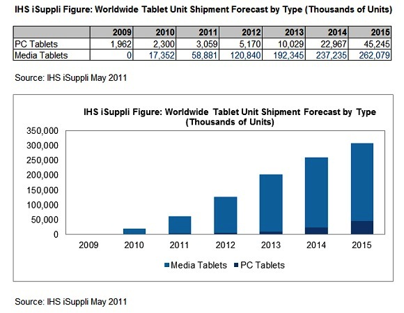 IHS iSuppli估計(jì),在2010年到2015年間,多媒體平板計(jì)算機(jī)的總出貨量將達(dá)到8.887億臺(tái),但同期間PC型平板計(jì)算機(jī)的出貨量?jī)H有8,880萬(wàn)臺(tái);在2015年,PC型平板計(jì)算機(jī)總出貨量預(yù)測(cè)為4,520萬(wàn)臺(tái),該數(shù)字在2010年為230萬(wàn)臺(tái),期間平均年復(fù)合成長(zhǎng)率(CAGR)為81.5%。但在多媒體平板計(jì)算機(jī)部分,出貨量在2010年為1,740萬(wàn)臺(tái),2015年將達(dá)到2.621億臺(tái),期間CAGR為17.4%。