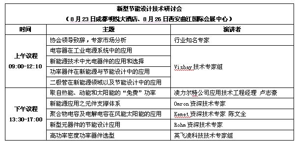 [page]新型節(jié)能設(shè)計(jì)技術(shù)研討會(huì)以風(fēng)能太陽(yáng)能發(fā)電與節(jié)能設(shè)計(jì)為主題,圍繞智能電源、逆變器設(shè)計(jì)、智能控制、馬達(dá)控制、新型電子元器件與模塊的應(yīng)用展開(kāi)探討,來(lái)自知名廠商的技術(shù)專家將分享逆變器設(shè)計(jì)、馬達(dá)控制、變頻技術(shù)、電力電子技術(shù)在風(fēng)能/太陽(yáng)能、工業(yè)電子、通信設(shè)備、軍工上的應(yīng)用解決方案和節(jié)能設(shè)計(jì)技術(shù)。