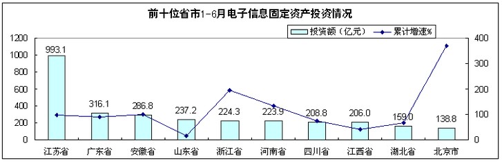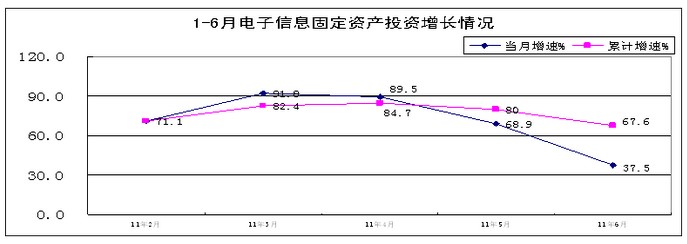 上半年,電子信息產(chǎn)業(yè)500萬元以上項目完成投資3960億元,規(guī)模接近去年前三季度水平,同比增長67.6%,高于去年同期26.6個百分點,高于同期工業(yè)投資40.7個百分點。自二季度起,投資增速高位回落,6月份增速(37.5%)比4、5月份分別回落52和31.4個百分點。