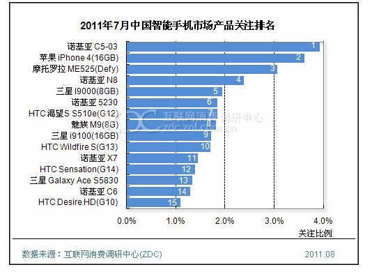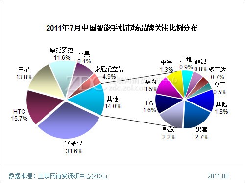 (圖) 2011年7月中國智能手機市場品牌關注比例分布[page]