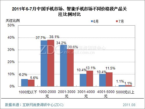 (圖) 2011年6-7月中國智能手機市場不同價格段產(chǎn)品關注比例對比