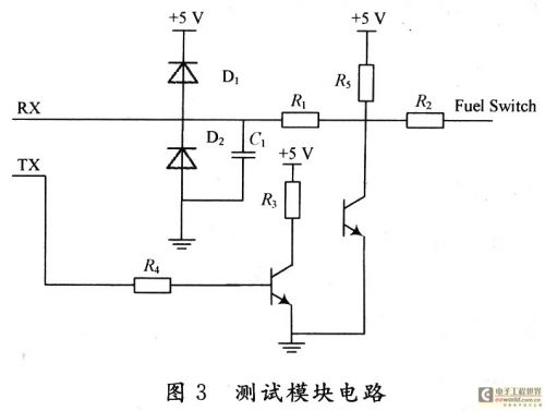 當(dāng)測試系統(tǒng)的TX端發(fā)送高電平時,A點(diǎn)為高電平,燃料開關(guān)Fuel Switch信號線也將接收到高電平,同時,測試系統(tǒng)的RX端也會接收到高電平。同理,當(dāng)測試系統(tǒng)的TX端發(fā)送低電平時,燃料開關(guān)FuelSwitch信號線也將接收到低電平,同時,測試系統(tǒng)的RX端也會接收到低電平。