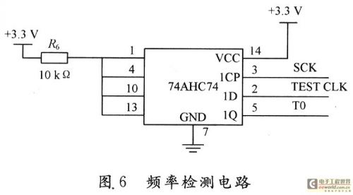 燃料開關(guān)是以數(shù)字通信方式與其他組件進(jìn)行協(xié)同工作的,異步通信的工作頻率則取自其中單片機(jī)的內(nèi)部時鐘,由于制造離散度及環(huán)境溫度等的影響,實(shí)際的工作頻率會發(fā)生漂移。為確保通信的可靠性,需要確認(rèn)燃料開關(guān)工作在適當(dāng)?shù)念l率范圍內(nèi),故需要對其實(shí)際的通信頻率檢測與確認(rèn)。要測試時鐘信號的頻率,可以通過測試一定區(qū)間內(nèi)脈沖的個數(shù)來實(shí)現(xiàn),測試時間越長,精度越高。本測試系統(tǒng)用D觸發(fā)器和單片機(jī)的計(jì)數(shù)、定時功能來完成此檢測。圖6即為此頻率檢測電路。