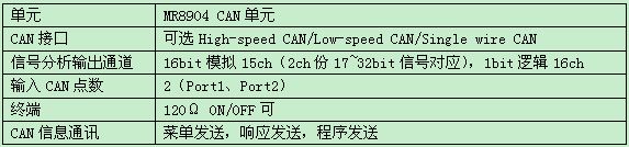使用MR8904單元,可測量CAN格式數(shù)據(jù),在汽車研發(fā)現(xiàn)場非常實用。(所謂CAN,即“Controller Area Network”,是獲取汽車引擎轉(zhuǎn)數(shù)、輪胎壓等數(shù)據(jù)的方式。)