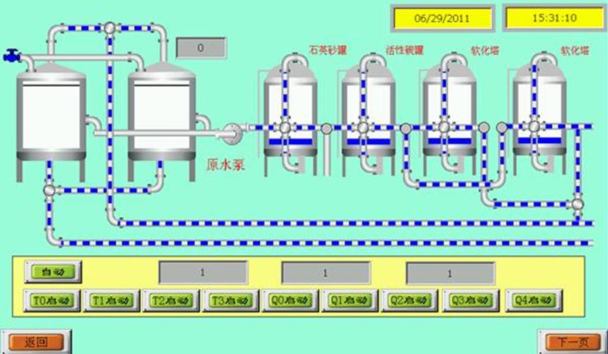 制藥用水是不含任何添加物的工藝用水。制藥用水的系統(tǒng)控制要控制這些雜質(zhì)的含量,同時還要有效處理和控制微生物及細菌內(nèi)毒素的污染。通常會采用離子樹脂交換、蒸餾冷凝、電滲析、反滲透等工藝方式。其制備流程大致分為五部分:預處理、初級除鹽裝置、深度除鹽裝置、后處理裝置、純水輸送分配系統(tǒng)。純化水設備包含機械部分和電氣部分:機械部分主要由水泵、壓力罐、水箱、電磁閥、過濾器和管路組成;電氣部分主要由可編程控制器(PLC)、觸摸屏、變頻器、壓力表、繼電器等組成。圖1為制備純化水的一個現(xiàn)場展示案例。