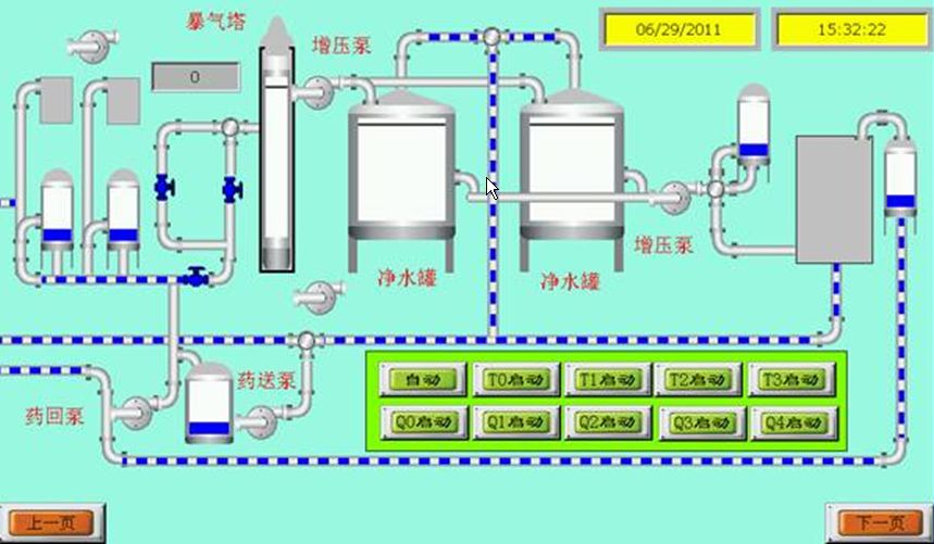 觸摸屏主要功能是顯示和控制制水過程中的數(shù)據(jù)以及水泵電磁閥的的運行狀態(tài)。PLC輸入量有各個閥門的開閉情況和各罐體的液位情況和壓力情況,其中輸入量中的液位是模擬量輸入;輸出量有水泵的啟動停止,電磁閥的開閉,報警等等。圖3為部分觸摸屏的控制界面(初期設計)。