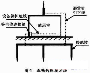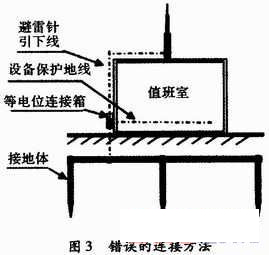 目前,關(guān)于共用接地有一種誤解,認(rèn)為將設(shè)備的接地引線無論怎樣連接,最終只要接在同一個(gè)接地體上就算是共用接地,如圖3所示。將“共引線”也誤認(rèn)為是“共地”。其實(shí)不然,所謂“共用接地”就是把許多不同性質(zhì)的接地裝置如電氣安全接地、交流電源工作地、通信及計(jì)算機(jī)直流地等匯集于一個(gè)等電位連接箱,使之成為一個(gè)等電位體,然后直接與接地體連接,而防雷地則通過另一條引下線與接地體連接。而不是將室內(nèi)設(shè)備接地與室外防直擊雷接地通過同一根引下線與地相連。更不允許將室內(nèi)接地引線與室外防直擊雷引線匯集與一個(gè)所謂的等電位連接箱,然后再與接地體相連。室內(nèi)接地引線要遠(yuǎn)離室外防雷引下線,如圖4所示。否則,遇雷擊時(shí),強(qiáng)大的雷電流在通過引線向大地泄放的同時(shí),室內(nèi)引線及所有設(shè)備上瞬間便會(huì)產(chǎn)生很高的電位差,設(shè)備難免遭到破壞。另外,假設(shè)與接地體相連的引線因銹蝕斷開或等電位連接端子接觸不良,一旦發(fā)生雷擊,強(qiáng)大的雷電流便會(huì)直擊至值班室設(shè)備上,這是非常危險(xiǎn)的。