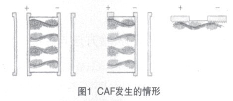 電子產(chǎn)品使用過程中性能是否穩(wěn)定涉及印制板的使用質量。使用中常遇見印制板的缺陷有:離子遷移(CAF)和焊點質量(Joint)等。銅離子遷移系透過玻纖紗束或紗束與樹脂之細縫,造成兩導體例如(孔壁到孔壁)間出現(xiàn)金屬銅的遷移,其產(chǎn)生機理是:印制板通電后由于電位差,高壓極(陽極)銅金屬在水氣中首先出現(xiàn)腐蝕而氧化成銅Cu2+,于是銅離子會沿著通道緩緩向另一端低壓極進行遷移,同時,低壓端也會往陽極移動,于是兩者在通道途中遭遇后即可還原出金屬銅,形成兩地間的連通即漏電短路,一旦出現(xiàn)短路,電阻頗高的發(fā)熱將CAF燒斷,爾后又開始新的CAF。這樣周而復始發(fā)生,造成電子產(chǎn)品功能時有時無。如下圖CAF發(fā)生的幾種情形。