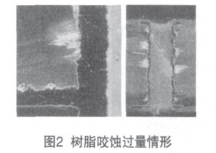 可見,產(chǎn)生CAF必須具備下列五種條件:裸露的銅導體、水氣、電解質、電位差和通道。前四項在電子產(chǎn)品的使用中不可避免。通道是唯一可控制產(chǎn)生CAF的途徑,而通道的形成主要與印制板的生產(chǎn)過程中材料、鉆孔、去沾污等因素相關。一般地來說材料的玻纖越細,樹脂含量越高,韌性越好,鉆孔撕裂的機率較低,因此,對于高密度的印制板或潮濕環(huán)境中使用的印制板盡可能采用細玻纖的材料。不同的材質的鉆頭,不同鉆孔數(shù)量,不同的鉆孔參數(shù),鉆孔時,鉆頭對增強材料的沖擊不同,孔壁質量的差異較大,對孔壁的損傷也不盡一致,芯吸程度不一。因此,為了杜絕通道的發(fā)生,應當嚴格控制鉆孔質量,確保孔壁光滑平整。去沾污主要目的是去除內層導體鉆孔時吸附樹脂,當然,也咬蝕孔壁絕緣層中的樹脂,有時為了形成負凹蝕,孔壁絕緣層樹脂甚至咬蝕更多。這時,咬蝕量需嚴格控制。否則,極易形成“通道” 。如下圖樹脂咬蝕過量情形。