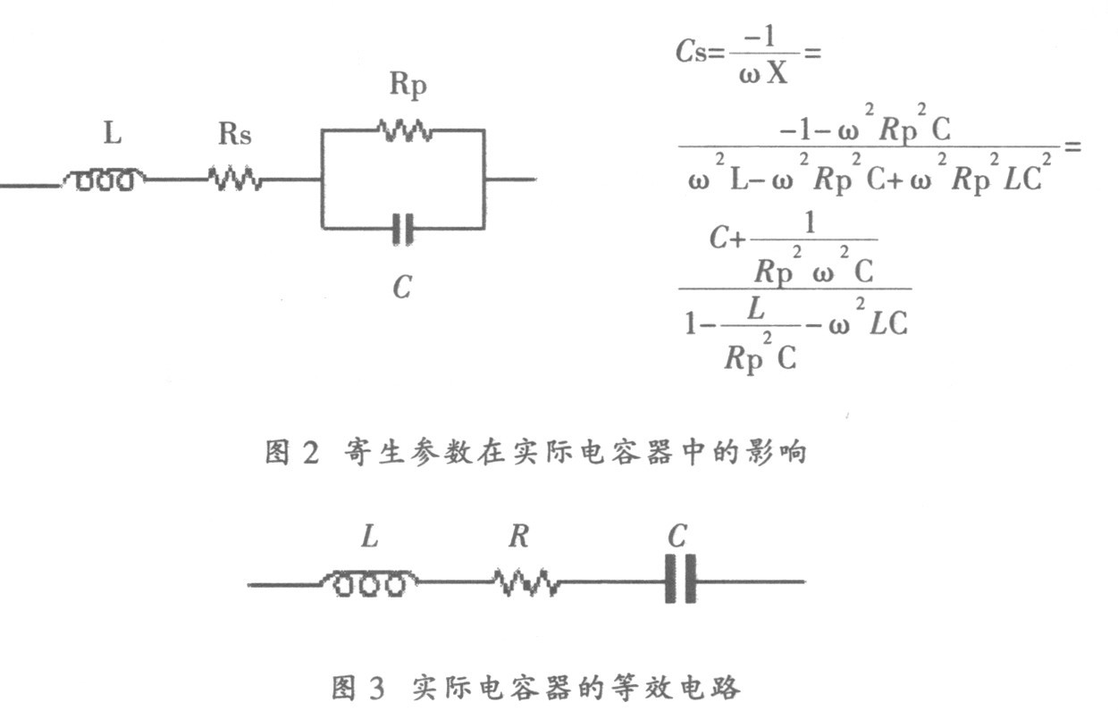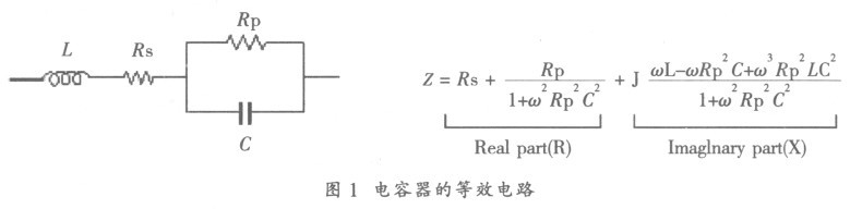 電容器的典型等效電路如圖1 所示, 在該電路中, 電容量C 是電容器的主要成分, Rs 和L 是引線和電極中存在的寄生參數(shù), Rp 代表兩個電極間的寄生泄漏參數(shù)。