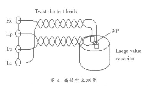 在電容器的測量中, 應(yīng)注意的事項與被測電容量有關(guān), 高值電容測量屬于低阻抗測量, 因此必須把接觸電極、測試夾具和電纜中的接觸電阻及殘余阻抗減到最低, 應(yīng)使用4 端、5 端或4 端對配置把DUT 接到儀器上。在使用4 端和5 端配置時, 必須確保高測試信號電流流過電纜, 為避免電磁場耦合的影響, 按圖4 所示的方式來連接電纜;此外, 為進行精確測量, 應(yīng)正確使用開路、短路補償。特別是對于施加直流偏置電壓的電解電容器,應(yīng)在直流偏置設(shè)置為ON (0 V) 時進行開路/短路補償。