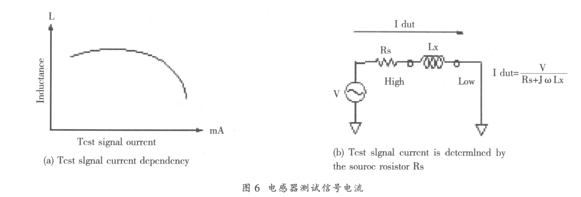 磁性電感器與測試信號電流的關(guān)系如圖6 (a)所示。電感量隨測量電流的大小而不同, 即使將兩臺不同的儀器設(shè)置為同樣的輸出電壓, 如果它們的源阻抗不同, 它們的輸出電流也將不同, 請參考圖6 (b)。有些磁性電感器的電感量與流過電流的關(guān)系很大, 電流的變化可導(dǎo)致電感值成倍地變化。我們多次遇到元件制造廠與元件使用廠家的糾紛就源于此。他們用不同的儀器測量同一產(chǎn)品的結(jié)果有很大的不同, 進而懷疑儀器有問題, 但儀器經(jīng)過我們計量校準(zhǔn)是合格的。其實就是因為儀器的源阻抗不同而導(dǎo)致通過測試件的電流不同, 測量結(jié)果當(dāng)然也就不一致。因此一些高檔的LCR 表有電壓、電流監(jiān)視器功能, 可監(jiān)測實際加在測試件上的電壓及流過測試件的電流。