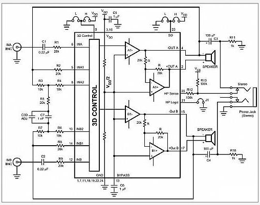 圖1所示的立體聲聲頻子系統(tǒng),是一個包含立體聲聲頻喇叭加耳機和3D增強裝置的放大器。也就是說,這個裝置具有立體聲喇叭及立體聲耳機驅(qū)動功能。當(dāng)電源電壓Vcc=5V時,立體聲喇叭最大輸出量可達到1.3W。當(dāng)每個通道在8Ω負(fù)載下、而負(fù)載降至3Ω時,則可支援每個通道達2.1W的輸出量,而耳機能夠在32Ω負(fù)載下輸送高達80mW至每個通道。此子系統(tǒng)利用兩個獨立的控制接腳來控制停機和3D開關(guān),操控方便,設(shè)計簡單,并提供耳機檢測功能。