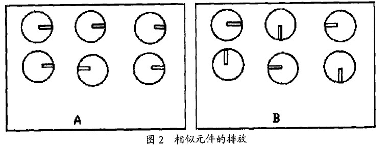 2)相似的元件在板面上應(yīng)以相同的方式排放。例如使所有徑向電容的負(fù)極朝向板件的右面,使所有雙列直插封裝(DIP)的缺口標(biāo)記面向同一方向等等,這樣可以加快插裝的速度并更易于發(fā)現(xiàn)錯誤。如圖2示,由于A板采用了這種方法,所以能很容易地找到反向電容器,而B板查找則需要用較多時間。
