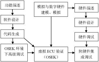 汽車電子產(chǎn)品是軟硬件結(jié)合的嵌入式系統(tǒng)。為了節(jié)約資源,縮短產(chǎn)品開發(fā)周期,一般應(yīng)采取軟硬件同步開發(fā)的方案。汽車電子產(chǎn)品的開發(fā)工具對(duì)軟硬件的同步開發(fā)、調(diào)試提供了很好的支持。汽車電子產(chǎn)品的軟件開發(fā)分為功能描述、軟件設(shè)計(jì)、代碼生成、操作系統(tǒng)環(huán)境下高級(jí)調(diào)試等步驟。汽車電子產(chǎn)品的硬件開發(fā)分為硬件描述、硬件設(shè)計(jì)、硬件調(diào)試等步驟。當(dāng)軟件設(shè)計(jì)完成后,通過使用相應(yīng)的工具,完成在虛擬ECU平臺(tái)上的驗(yàn)證。當(dāng)硬件設(shè)計(jì)完成后,與硬件一起進(jìn)行軟硬件集成調(diào)試。通過這種開發(fā)方式,縮短了產(chǎn)品上市的時(shí)間。