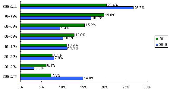 2011調(diào)查中國外品牌元器件占采購總額比例平均為58.6%,比2010調(diào)查的57.1%上升1.5%。采購國外品牌元器件占采購總額比例為70-79%、60-69%、50-59%三個(gè)區(qū)段的系統(tǒng)廠商占47.8%,是采購的主體,研發(fā)活動(dòng)活躍,這三個(gè)部分呈現(xiàn)出對國外品牌元器件需求的快速增長。而采購國外品牌比例在80%以上和20%以下是采購的兩極,這兩極通過平衡采購比例來分散采購風(fēng)險(xiǎn),因此,這兩極的系統(tǒng)廠商數(shù)量比2010調(diào)查有顯著降低。雖然2010年的元器件缺貨給國產(chǎn)元器件進(jìn)入AVL(合格供應(yīng)商,Approved Vendor List)帶來機(jī)會,但是該趨勢還未對電子元器件供應(yīng)鏈整體產(chǎn)生顯著影響。